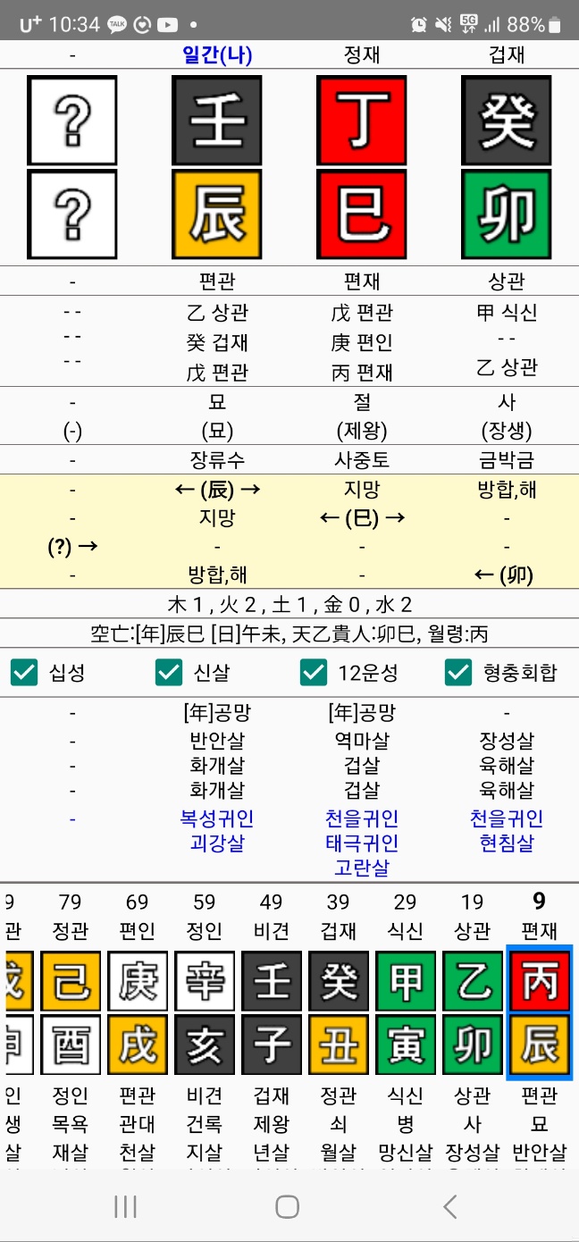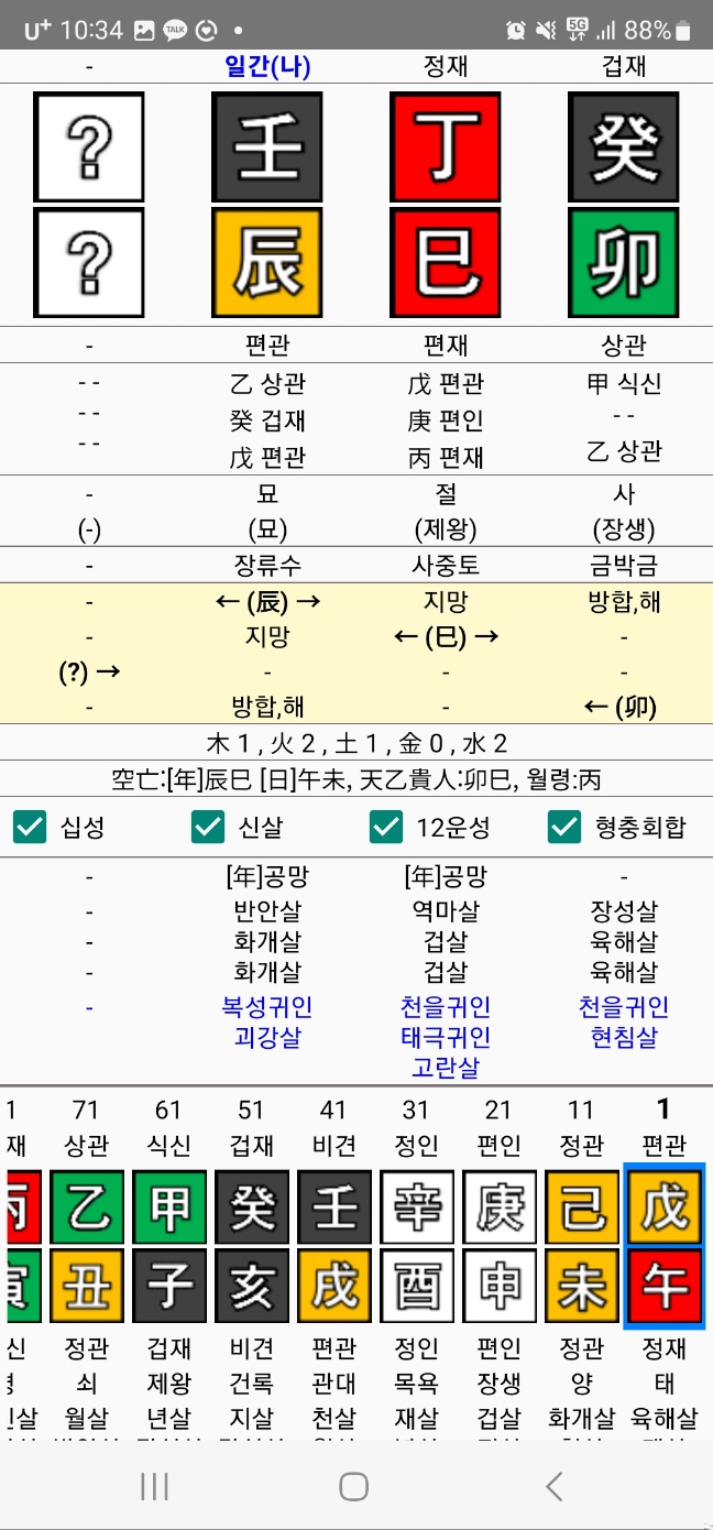 특이한 점은 년월에 천을귀인을 두 개나 깔고 있는데 일지에는 괴강살이 있으므로 평소에는 얌전하고 조신하다가 한번씩 열받을 때는 눈 뒤집어 까고 길길이 날뛰는 사람일 것이다.