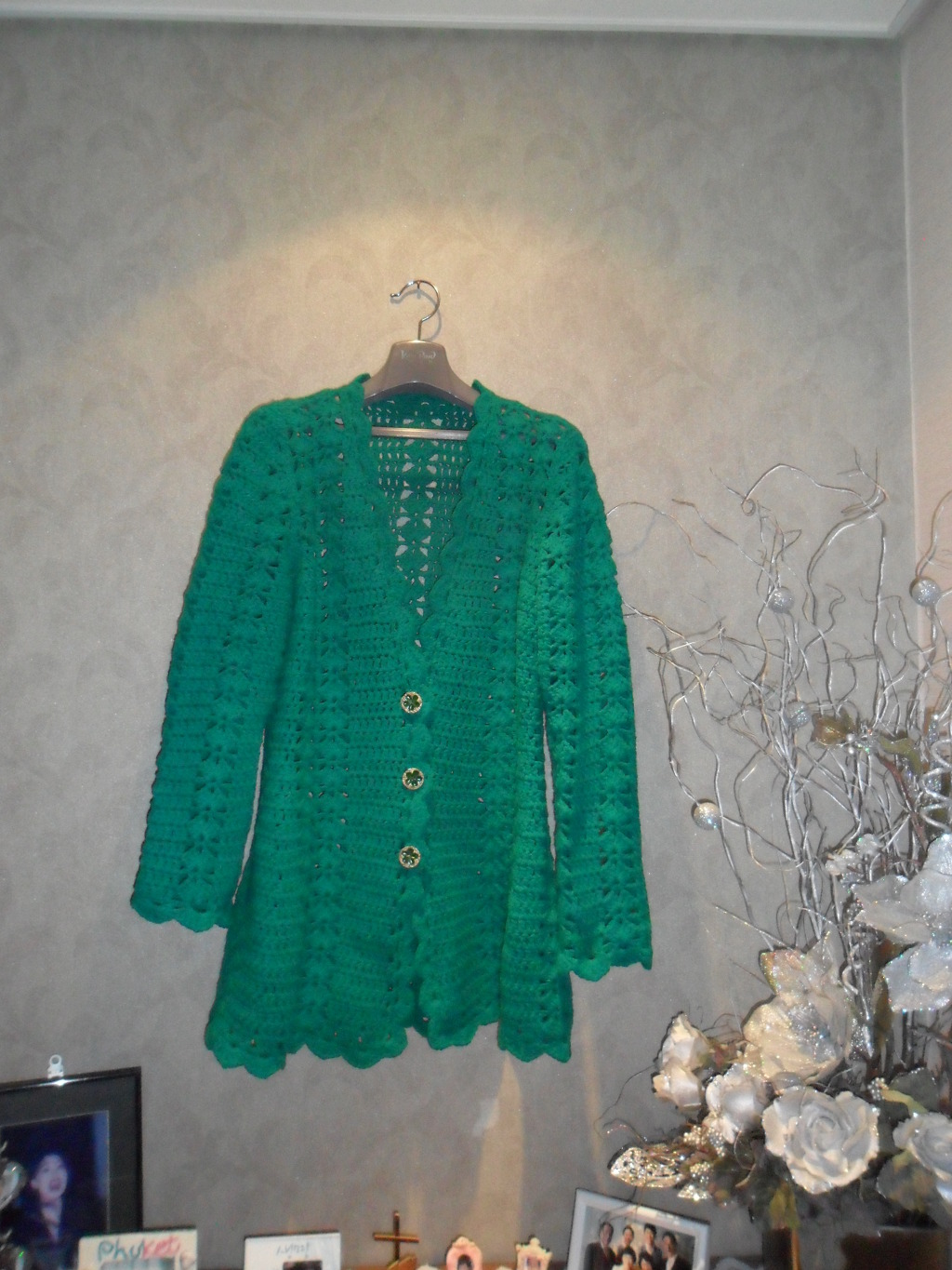 실이오던날(목요일)은손도못대고 다음날(금요일)저녁부터 열심히떠서 토요밤 12시에마치고 찍어주실분이 먼저주무시는바 람에 걸어놓고 뉘어서찍었더니 입고볼때보다 예쁘지가않군요 그리고밑단에칭을많이잡아서우네요 수정후 착용하고또올릴까하다가 먼저올려봅니다 사진색상이 실제실색상과다르게나왔어요 밑단에칭고치고입고 다시올려볼께요