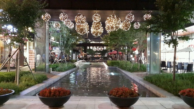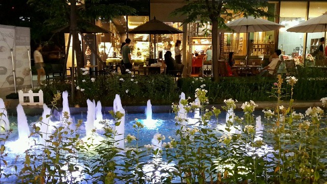 빙수가게에 빈 자리가 없는 탓(덕)에 근사한 조경의 분수대 테이블에 앉아