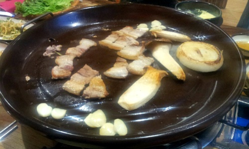 이 집, 항아리 뚜껑처럼 생긴 질그릇에 굽는 쫄깃한 삼겹살도 맛있고