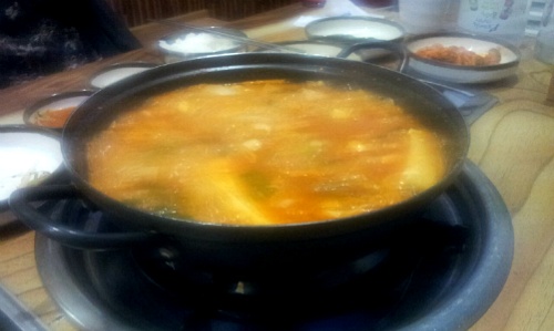 저쪽에는 김치찌개가 끓고 있습니다.
