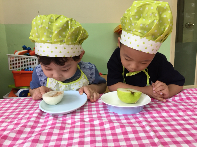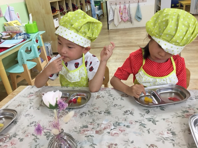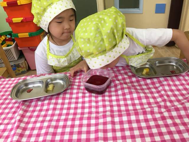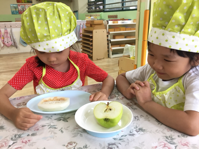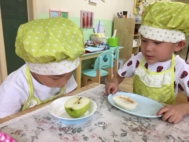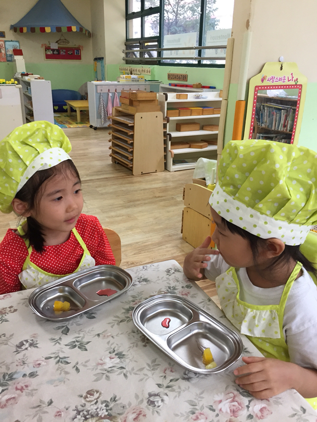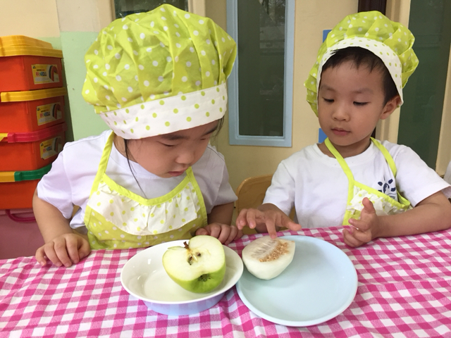 오늘의 주재료가 되는 과일중 사과와 참외의 반쪽을 탐색하는 시간을 가졌습니다~~ 사과의 반쪽이 하트 모양이라고 하고 참외의 씨가 몇 개인지 궁금한지 하나,둘,셋..... 세어보는 친구들도 있었습니다~~^^