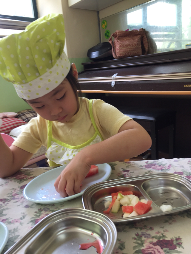 지금 먹으면 나중에 화채 만들어 화채국물만 먹게 될거라고 하니 참고 또 참는 햇살반 귀염둥이들~~^^
