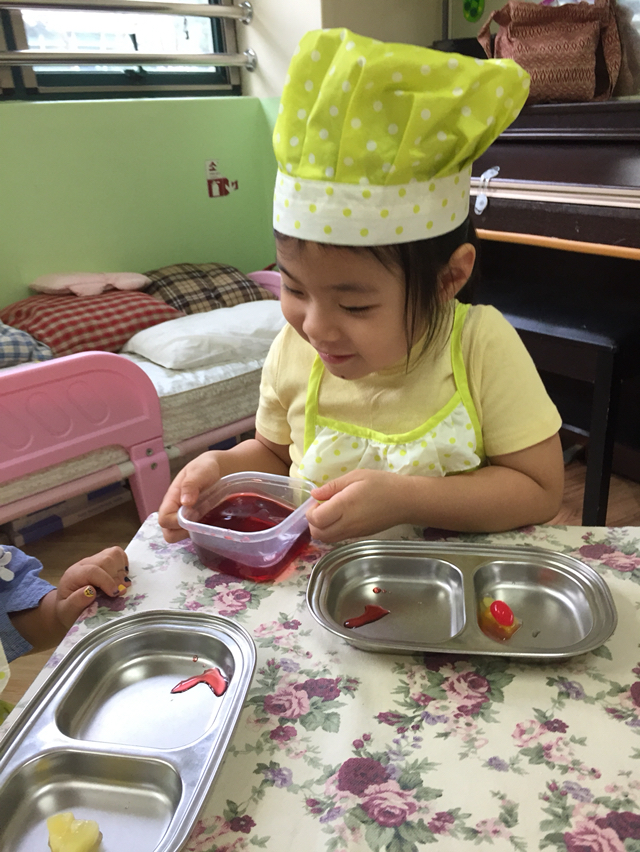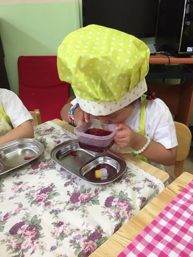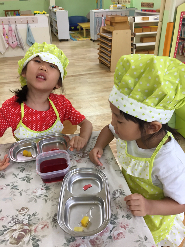 과일화채의 맛을 더해줄 오미자즙의 향을 맡고 손으로 콕! 찍어 맛도보고 후르츠 칵테일의 과일 맛도 보았습니다~~^^