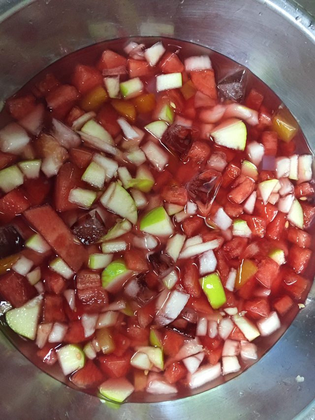 친구들이 썰어 넣은 과일에 후르츠 칵테일과 오미자즙을 넣어서 섞은 후 냉장고에 넣어났다가 오후에 꺼내보니