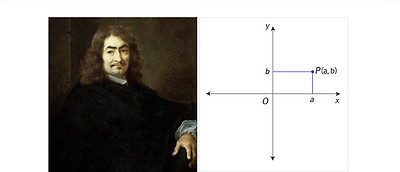 | 근세 철학의 아버지로 불리는 프랑스 수학자 르네 데카르트(René Descartes, 1596-1650)가 1637년 ‘방법서설’(方法敍說, Discours de la méthode)을 발표하면서부터 이 상황에 돌파구가 열렸다. 방법서설의 부록 세 편 중 한 편에 오늘날 ‘직교 좌표계’ 혹은 ‘데카르트 좌표계’(Cartesian coordinate system)라고 부르는 개념이 들어 있었던 것이다. 위의 그림처럼 평면에 동서 방향 및 남북 방향으로 각각 x축, y축이라 부르는 서로 수직인 두 직선을 그리고, 만나는 점을 원점 O라 한 것을 데카르트 좌표계라 부른다. 이렇게 하면 평면 위의 임의의 점 P는 각 축에 내린 수선의 발이 결정하는 두 숫자 a, b의 순서쌍 (a, b)와 일대일 대응한다. 누구나 생각할 수 있을 정도로 간단해 보이는 이런 발상이 현대 수학의 지평을 열었다는 것은 상당히 놀라운 일이다. 차츰 보겠지만, 좌표계를 도입하면 기하학의 많은 문제를 대수학의 문제로 바꿀 수 있다. 보조선을 긋지 않고도(!) 대수 방정식을 풀어서 기하학의 문제를 해결하는 시대가 열린 것이다. | |