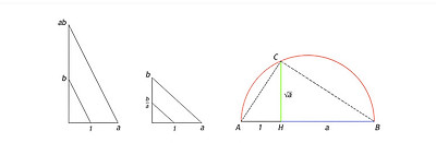 a×b와 b/a를 작도하는 방법(좌), 루트a를 작도하는 방법(우)