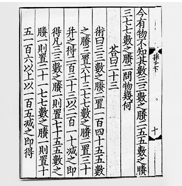 이것이 문제의 답이 될 수 있다. 그런데 언급하지 않아도 통상 조건을 만족시키는 가장 작은 값을 찾는 것이 관례였다. 그래서 157에서 세 수 3, 5, 7의 최소 공배수 105를 필요한 만큼 몇 번 빼서 답을 얻는다. 다음이 이 문제의 답이다.