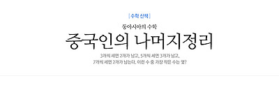 70 : 5와 7의 공배수 중에서 3으로 나누면 나머지가 1인 가장 작은 수 21 : 3과 7의 공배수 중에서 5로 나누면 나머지가 1인 가장 작은 수 15 : 3과 5의 공배수 중에서 7로 나누면 나머지가 1인 가장 작은 수 105 : 3, 5, 7의 최소 공배수