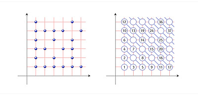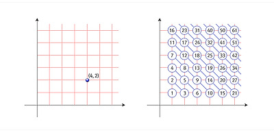 그런데 위의 방식으로 번호를 붙이면, 예를 들어 2010이 어느 격자점에 붙는지 계산하는 건 무척 귀찮은 일이다. 역으로 예를 들어 유리수 13/27에 붙는 자연수가 무엇인지 계산하려면 골치가 아프다. (독자들은 이런 계산 문제를 만난 경험이 있거나, 앞으로 만날 가능성이 많다.) 그런데 깔끔하면서도 뜻밖에 알려지지 않은 일대일 대응이 있어 소개하려고 한다.