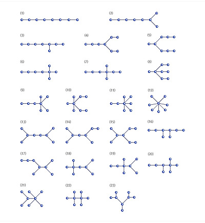 꼭짓점이 6개인 서로 다른 트리의 개수를 구하는 방법과 같은 방법으로 꼭짓점이 8개인 서로 다른 트리의 개수를 구할 수 있다. 꼭지점이 8개인 서로 다른 트리는 다음과 같이 모두 23개이다.