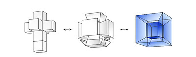 | 실제로 위의 전개도를 다음 그림과 같은 차례로 이어 붙인다면 초입방체를 얻을 수 있다. 전개도에 있는 정육면체를 탄력이 매우 좋은 고무라고 생각하고 이어 붙이는 것이다. (수학에서는 안 되는 것이 없다!) | |