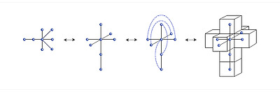 이제 위의 (11)번 짝트리를 이용하여 앞에서 보여준 초입방체의 전개도가 어떻게 그려졌는지 알아보자. 다음 그림과 같이 (11)번 트리의 인접하지 않은 꼭짓점끼리 연결하면, 트리의 변은 정육면체가 붙어있는 것을 나타내므로 전개도를 확인할 수 있다.