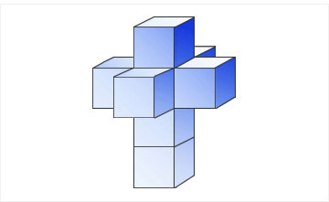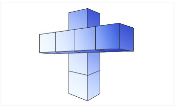 그러면 이 초입방체의 전개도는 몇 개가 있을까? 이 질문에 대하여 1985년에 피터 터니(Peter Turney)는 그래프의 일종인 트리를 활용하여 도형의 전개도의 개수를 구하는 방법을 소개했다. 이 트리를 활용하는 터니의 방법으로 4차원 초입방체의 전개도와 그 개수를 구하여 보자. 정육면체의 전개도의 종류와 마찬가지로 4차원 초입방체의 전개도의 종류도 매우 많다. 그 가운데 아래의 전개도를 보면 8개의 정육면체가 붙어 있는 모양이다. | |