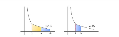 영역 S를 x축 방향으로 a배 줄이고 y축 방향으로 a배 늘려도, 영역의 넓이는 변하지 않을 것이다. 그런데 곡선 y = 1/x는 x축 방향으로 1/a배, y축 방향으로 a배 해도 여전히 y = 1/x이다! 따라서 오른쪽 그림의 파란색으로 칠한 부분의 넓이인 ln(b)와 같아진다!