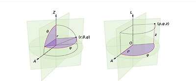 구면좌표계(좌)와 원주좌표계(우)를 설명한 그림. <출처: Jorge Stolfi>