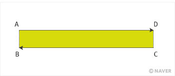 이 꼬임으로 띠는 특별한 성질을 가지게 된다. 종이를 잘라 띠를 만든 후 그 띠를 한 번 꼬아서 붙이면 다음 그림과 같이 모서리 AD의 화살표와 모서리 CB의 화살표가 같은 방향으로 가는 하나의 화살표가 된다. 즉 꼭짓점 A는 꼭짓점 C, 꼭짓점 D는 꼭짓점 B와 일치하게 된다. | |