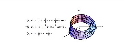 이런 뫼비우스 띠를 수학적으로 표현하면 어떻게 될까? 3차원 실공간 R3에서 뫼비우스 띠는 두 매개변수 u, v(0≤u≤2π, -1≤v≤1)를 이용하여 다음과 같은 매개변수방정식으로 나타낼 수 있다. | |