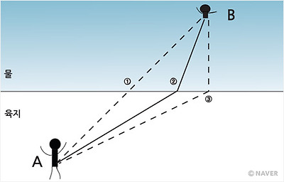 그건 그렇고, 최소 시간의 원리에 관련하여 파인만이 재미있는 비유를 든 게 하나 있다. 원작보다 훨씬 재미없게 각색한 점 너른 양해 바란다. 여기는 해안가다. 나는 육지의 지점 A에 서 있는데, B 지점에 물에 빠져 허우적대는 미인을 발견했다. 한시바삐 구하자는 마음에 직선 거리로 곧장 뛰기 시작해야 하는 걸까? 박태환 선수라면 몰라도 대부분의 사람은 헤엄치는 속도가 달리는 속도보다는 훨씬 느릴 것이다. 따라서 곧장 B 방향으로 뛰어서는 안 된다. 구조 작업은 시간을 다투는 일이므로, 시간이 가장 적게 들도록 경로를 택해야 구조에 성공할 가능성이 높다는 애기다. 해상 구조 요원 여러분. 평소 미분 많이 하세요. 임계점 정리가 해답을 줍니다. | |