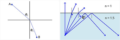 스넬의 법칙을 설명하는 그림(좌), 굴절률이 높은 매질에서 낮은 매질로 빛이 진행할 때는 입사각이 어떤 임계각을 넘으면 전반사가 일어난다(우)