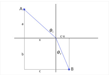 오른쪽 그림에서처럼 경계면으로부터의 점 A의 높이를 a라 하고, 점 B의 깊이를 b라 하자. 또한 AB의 수평 거리를 c라 하자. 경계면에 닿기 전까지 빛의 속도를 v, 경계면을 지나친 후의 빛의 속도를 w라 하자. A로부터 수평거리 x인 곳에서 굴절이 됐다면, A에서 B까지 이르는 데 걸린 시간은 다음과 같다. | |