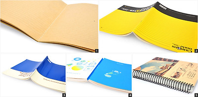 공책 제본의 다양한 방식. 1) 실 제본, 2) 중철 제본, 3) 무선 제본, 4) 양장 제본, 5) 스프링 제본