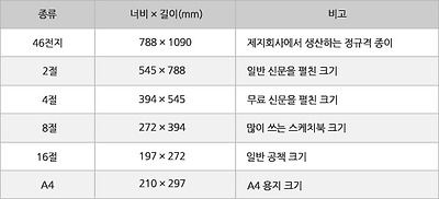 용지의 크기에 따라 사용 용도도 달라진다(46전지의 경우). 용지 크기의 기준 중 하나인 46전지는 너비가 788mm, 길이가 1,090mm로 일본에서 쓰는 규격을 그대로 가져온 것이다. |