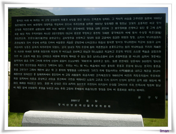 정상 부근까지는 약간의 경사가 있는 오름 능선 길이었다. 그 능선 끝에서 제일 먼저 만나게 되는 것이 황석산성이다. 봉우리와 계곡의 지형을 이용하여 쌓은 포곡식(包谷式) 산성 동문이다. 내가 알기에는 가야를 멸망시킨 신라가 백제와 대결하기 위하여 쌓았다는 산성인데 복원한 산성이 고풍스런 맛이 전혀 없다. 여기가 바로 정유재란 때 조총으로 무장한 왜놈들을 맞아 싸우다가 동문을 지키던 조방장(助防將) 김해부사 백사림(白士林)이 도망하는 바람에 성이 함락되고, 그 바람에 함양군수 조정도와 안의현감 곽준과 그 군민 500여명이 장렬히 순국한 황석산성이다.