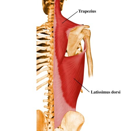 아까 얘기했던 pectoralis major (대흉근) 역시 큰 근육입니다. 이것말고 등에 큰 사다리꼴 모양을 형성하는 Trapezius (승모근)가 있습니다. 이 Trapezius (승모근) 밑에 바로 상완근의 신전에 가장 강하게 작용하는 Latissimus dorsi (광배근)이 있습니다. Latissimus dorsi (광배근)은 라틴어로 넓은 등이라는 뜻을 지니고 있습니다. 그리고 어깨쪽 견관절을 거의 대부분 덮고 있는 Deltoid (삼각근)이 있습니다. 이런 큰 근육들은 우리가 눈으로도 볼 수 있는 근육들입니다.