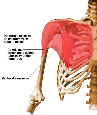 여기서 착각하기 쉬운 것은 보통 major muscle이 위에 있고, minor muscle이 아래에 있을 것 같지만 이 두가지 근육 모두 minor muscle이 먼저고, 그 바로 아래에 major muscle이 있습니다. 마지막으로 가슴쪽에 있는 pectoralis major & minor (대 & 소흉근)가 있습니다. pectoralis minor가 심부에 있고, 그 위를 pectoralis major가 덮고 있습니다.