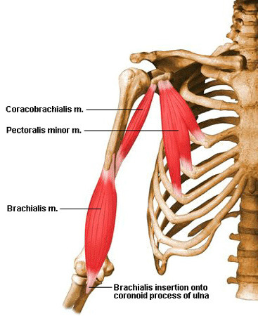 그렇습니다! 3개의 기시이므로 3이라는 뜻의 tri를 사용해 triceps brachii (상완삼두근)이 되는 것입니다. 마지막으로 견관절을 굴곡할 때 처음 작용하는 근육이며 scapula의 coracoid procss (오훼돌기)에서 기시하는 근육인 coracobrachialis (오훼완근)이 있습니다.