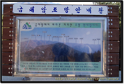 금대암 앞뜰에는 지리산 능선을 조망할 수 있는 전망대가 있다. 지리산 주능선은 서북방의 노고(老姑)단으로부터 동남방의 천왕봉 (天王峰) 까지 활처럼 휘어지며 동북방을 껴안는 듯한 모습이다. 이 금대암 전망대가 바로 지리산 주능선의 동북방이다. 여기에서 지리산 주능선을 조망하면 한눈에 다 볼 수 있는 곳이다. 금대암의 주전인 극락전에서 바로 마주 보이는 곳이 천왕봉이다