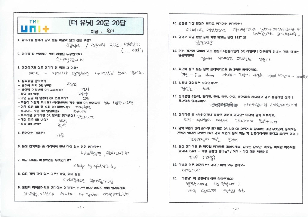 더 유닛 은이 20문 20답! 작성자달빛|작성시간18.01.04|조회수348 목록 댓글 0 글자크기 작게가 글자크기 크게가 찍먹 머리 짬뽕 면 소주 4잔 피자호빵 닭다리살 반숙 보쌈그냥... ㅇㅇ.. 제 취향이에요...ㅋㅋㅋㅋ그나저나 주량이 ㅎㄷㄷ하네요!!!! 다음검색 현재 게시글 추가 기능 열기 북마크 공유하기 신고 센터로 신고 댓글 댓글 0 댓글쓰기 답글쓰기 댓글 리스트