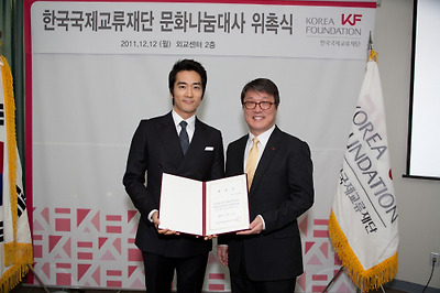 한국국제교류재단(이사장 김병국ㆍ오른쪽)은 12일 오후 4시 외교센터(서초구 서초동 소재) 회의실에서 한류스타 송승헌<왼쪽>씨를 재단의 ‘문화나눔 대사’로 위촉했다.