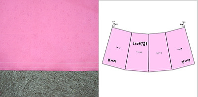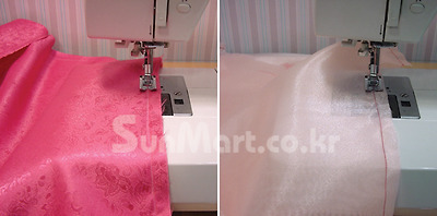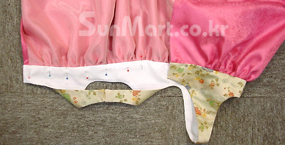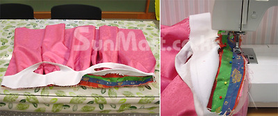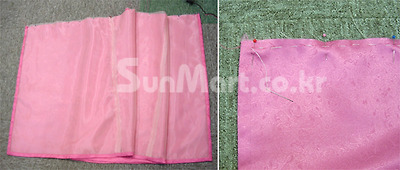 | 만들기 9 : 만들기 6의 오른쪽 그림처럼 폭이 연결될수 있도록 겉끼리 맞대고 시침핀을 3~4cm 간격으로 완성선의 양끝을 먼저 꽂고 중심을 꽂아 고정하고 시접 끝에서 시접끝 까지 바느질하여 치마의 겉감과 안감을 완성합니다. 시접은 가름솔로 다림질합니다. |