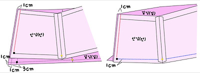 | 만들기 8 : 치마단의 시접은 1cm와 4cm 선을 안으로 두번 접어 올려 왼쪽 그림처럼 접힐 것이므로 접어올렸을때 그림과 같이 튀어나온 시접을 사선으로 잘라주고 펴서 완성선 1cm 완성선을 수정하여 그려줍니다. |