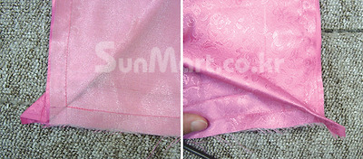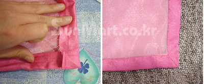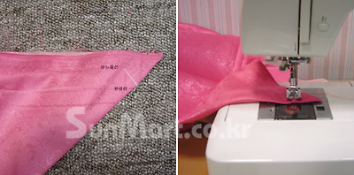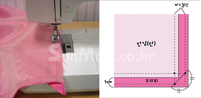 | 만들기 14 : 안감 쪽에서 모서리를 왼쪽 그림처럼 다림질하고 뒤집어 다림질로 정리하면 치마 모서리가 매끈하게 뒤집어 집니다. |