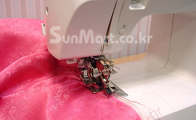 | 만들기 16 : 조끼허리의 허리 완성선보다 치마의 허리 완성선이 더 길기 때문에 긴만큼 주름을 주도록 합니다. 뒤 여밈부분은 주름이 없으므로 주름계산량에서 제외합니다. 주름 너비는 1cm 정도로하고 주름수와 주름분량은 다음과 같이 계산합니다. 조끼허리길이 = A cm , 치마폭 허리둘레 = B cm, 주름너비 = 1cm 안자락의 주름을 잡지 않는 부분 = 10cm 일때 주름수 = ( 조끼허리길이 - 안자락의 주름을 잡지 않는 부분 ) / 주름너비= ( A - 10) / 1 = C 개 속주름분 = ( B - A ) / C = D cm 주름의 방향은 안자락쪽으로 향하게 잡아 홈질하여 고정합니다. 그러나 저는 러플러 노루발을 이용하여 1cm간격으로 주름을 잡아주었습니다. 계산하지 않고 허리선 전체에 1cm 주름을 잡고 조끼허리보다 치마의 허리선이 짧을 경우 안자락의 주름을 풀어 맞쳐 줍니다. |