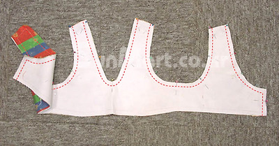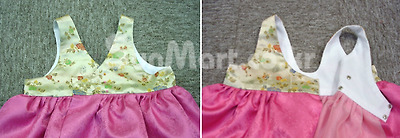 | 만들기 5 : 뒷길을 잡아당겨 조끼허리를 뒤집습니다. 그림과 같이 어깨의 연결선의 시접이 보이지 않습니다. |