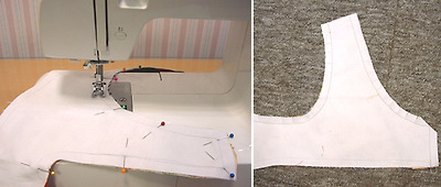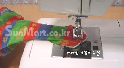 | 만들기 4 : 일치시킨 어깨의 완성선을 시접 끝에서 끝까지 바느질한다. |
