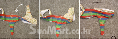 | 만들기 3 : 왼쪽의 그림처럼 조끼허리의 뒷길들만 겉이 나오도록 뒤집은 후, 뒤집은 뒷길의 어깨를 뒤집지 않은 앞길의 어깨 속으로 그림과 같이 집어 넣어 완성선을 일치시킵니다. |