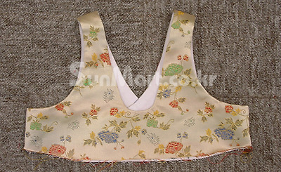 | 재단하기 : 면원단으로 조끼허리감을 2장 재단합니다. 그러나 저는 48강에서 사용한 양단이 조금 남아있어 조끼허리의 겉감을 조금 화려하게 표현하려고 면으로 안감한장 양단으로 겉감한장씩 두장을 준비하였습니다. 치마감은 겉감 치마폭4장과 안감 치마폭 4장씩 8장을 준비합니다. |