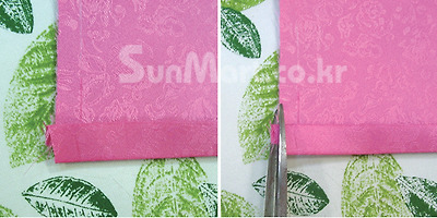 | 만들기 2 : 붉은 점선을 시침핀을 뽑아가며 바느질 한후 곡선부분에 그림처럼 가위밥을 줍니다. 뒤집었을때 각이 지거나 울면 가위밥을 더 촘촘이 주고 가위밥은 바느질한 것이 잘리 지 않도록 유의하면서 깊게 주도록 합니다. |
