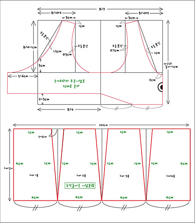 | 제도하기 : 알파벳 B는 가슴둘레를 말합니다 예를 들어 가슴둘레가 70cm일 경우 B/4는 17.5cm 입니다. 조끼허리의 모든 시접은 1cm로 하고 치마감의 단과 자락부분은 시접을 4cm로 합니다. 조끼허리는 패턴을 종이에 제도하여 사용하고 치마감 재단은 원단에 그려서 재단하시면 편리합니다. |