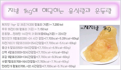 그럼 지방 1kg에 해당하는 음식량과 운동량을 참고자료로 첨부해 드리고 정리 하도록 할께요^^