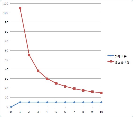 →한계비용은 생산이 한 단위씩 증가할 때마다, 일정하게 5$가 추가된다.