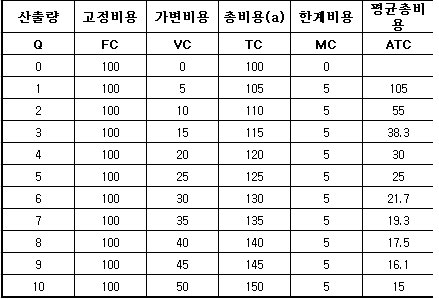 a.산출량이 1에서 10까지 변할때 총 생산비를 나타내는 표를 만들어라.