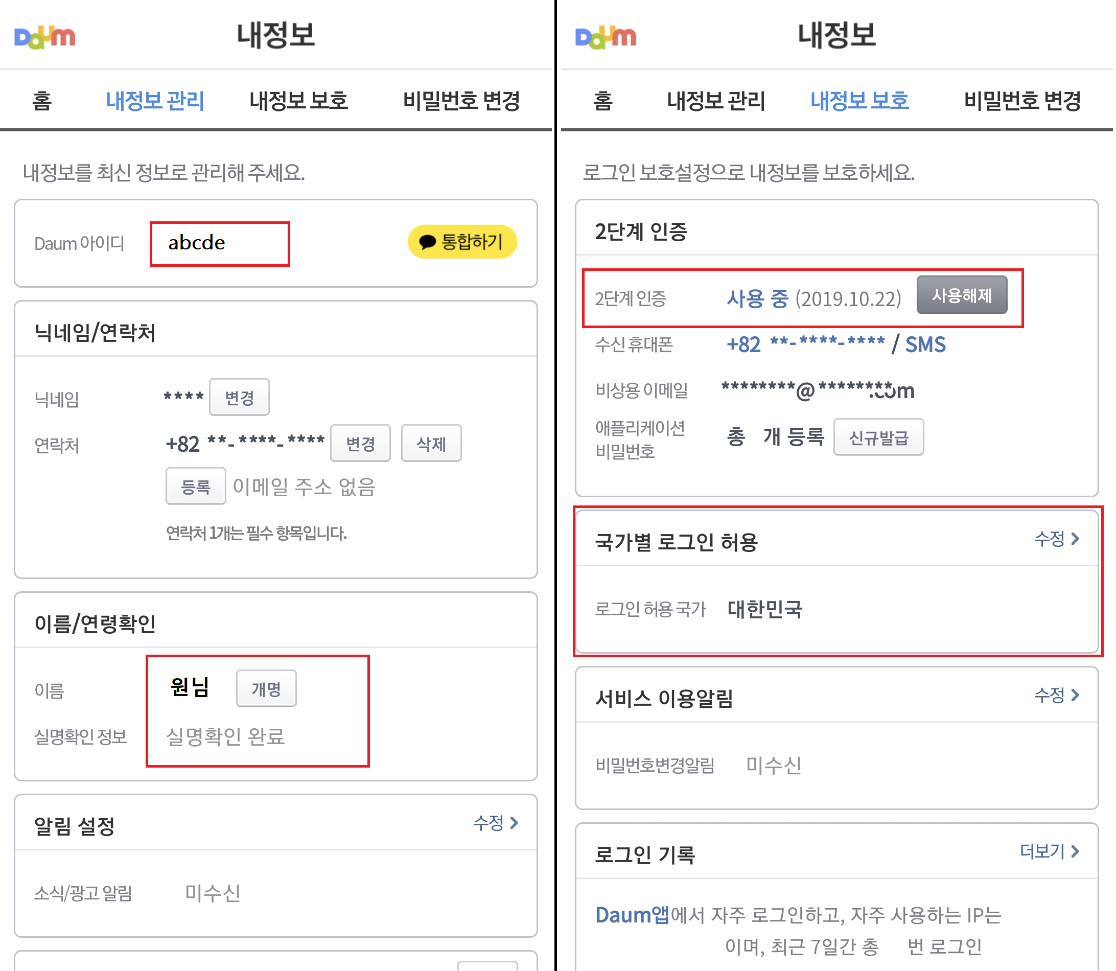 Daum 아이디와, 이름, 실명확인 완료, 2단계 인증 사용 중, 국가별 로그인 허용 국가 대한민국 설정한 것을