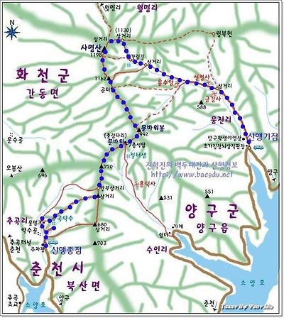 산행코스 : 웅진상회-첫번째 삼거리-세번째 삼거리-1130봉-사명산 정상-문바위봉-문바위-추곡약수터-