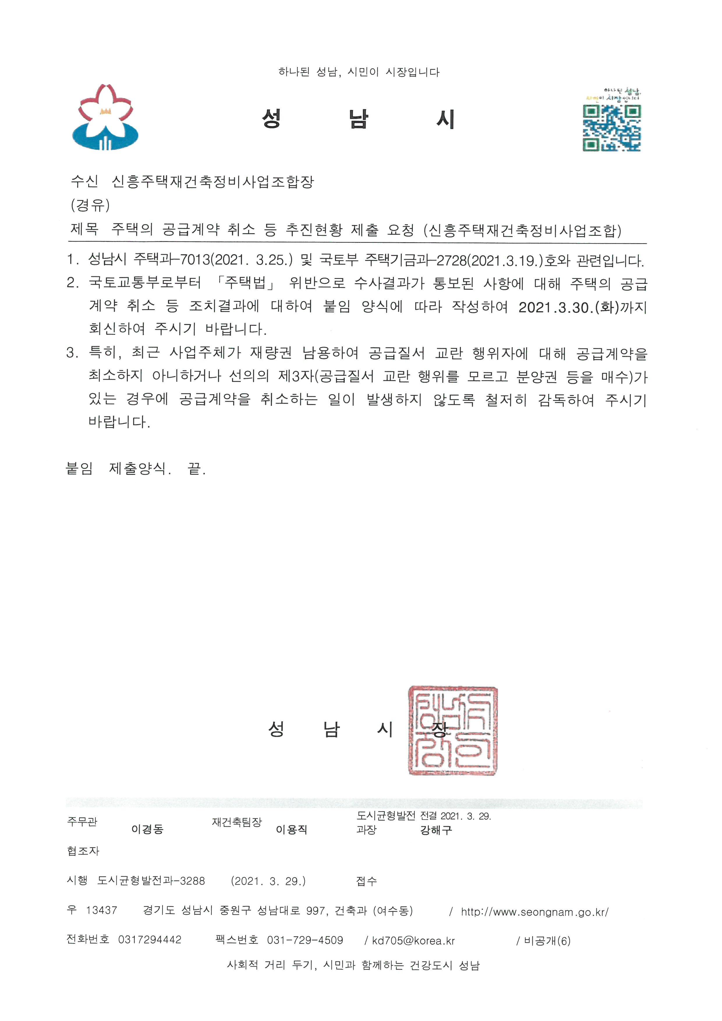 [도시균형발전과] 주택의 공급계약 취소 등 추진현황 제출 요청(신흥주택재건축정비사업조합) 작성자전정미(사무장)|작성시간21.04.01|조회수41 목록 댓글 0 글자크기 작게가 글자크기 크게가 다음검색 현재 게시글 추가 기능 열기 북마크 공유하기 신고 센터로 신고 댓글 댓글 0 댓글쓰기 답글쓰기 댓글 리스트